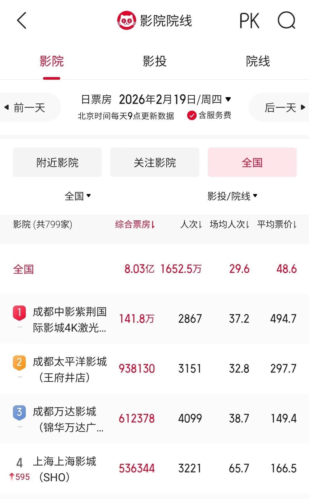 2月19日,《镖人:风起大漠》《惊蛰无声》《飞驰人生3》三部电影同时在成都开启路演。猫眼平台数据显示,19日当天,成都有三家影院分别以141.8万元、93.8万元、61.2万元的单日票房包揽全国前三,将第四名远远甩在身后;其平均票价分别高达494.7元、297.7元、149.4元,与48.6元的全国平均价格相比贵得令人咋舌。