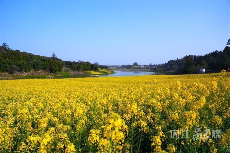 在龙门镇甘家渡村,油菜花沿沱江湾岸生长,形成独特的江畔花带景观。金黄花海依偎着碧绿江水,江水潺潺、蜂蝶飞舞,原生态的江畔风光,让人流连忘返。