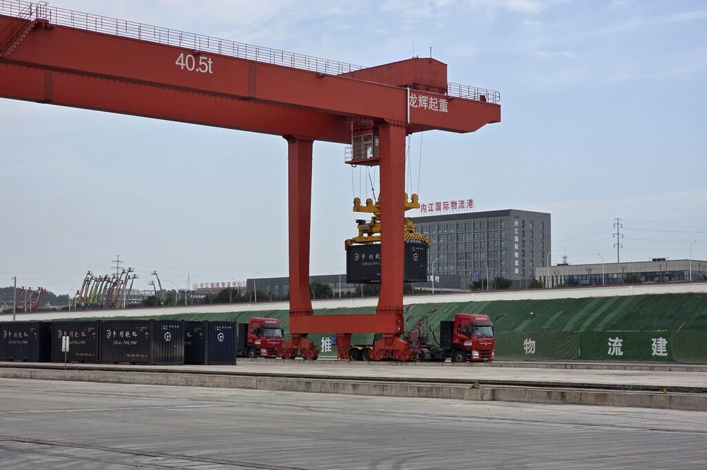 内江国际铁路港内龙门吊正在起吊货物。内江国际铁路港供图
