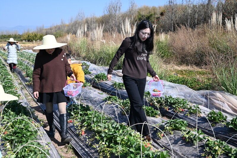 记者准备离开时,陈虹良正蹲在地头,帮一大家子游客拍照。头发花白的老太太挎着刚摘的篮子,满脸笑意;孙辈们蹲成一排,手里举着自己的“战利品”;年轻的父母站在后面,镜头里全是红扑扑的脸蛋和红彤彤的草莓。