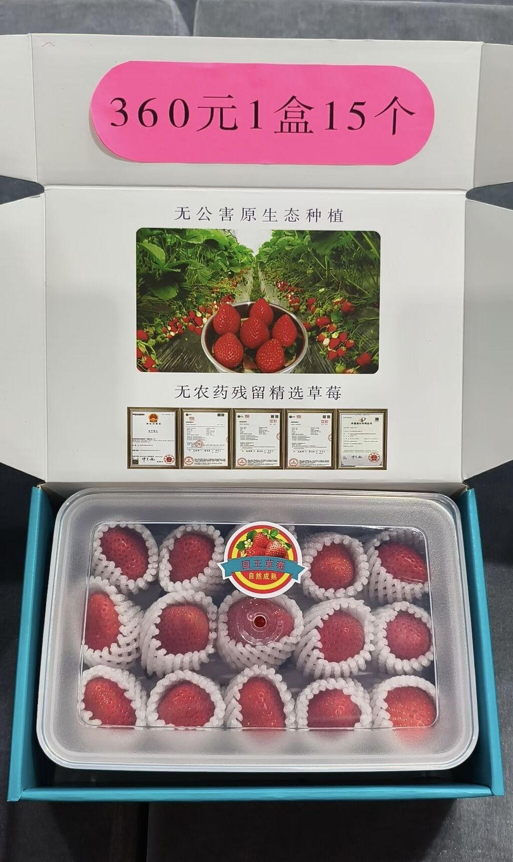 据悉,广告牌上的葡萄、草莓由辽宁营口澍诚国峰农业有限公司售卖,种植基地在辽宁省营口市熊岳镇黎明村,品种为“国王草莓”,360元/斤是全国统一零售价。