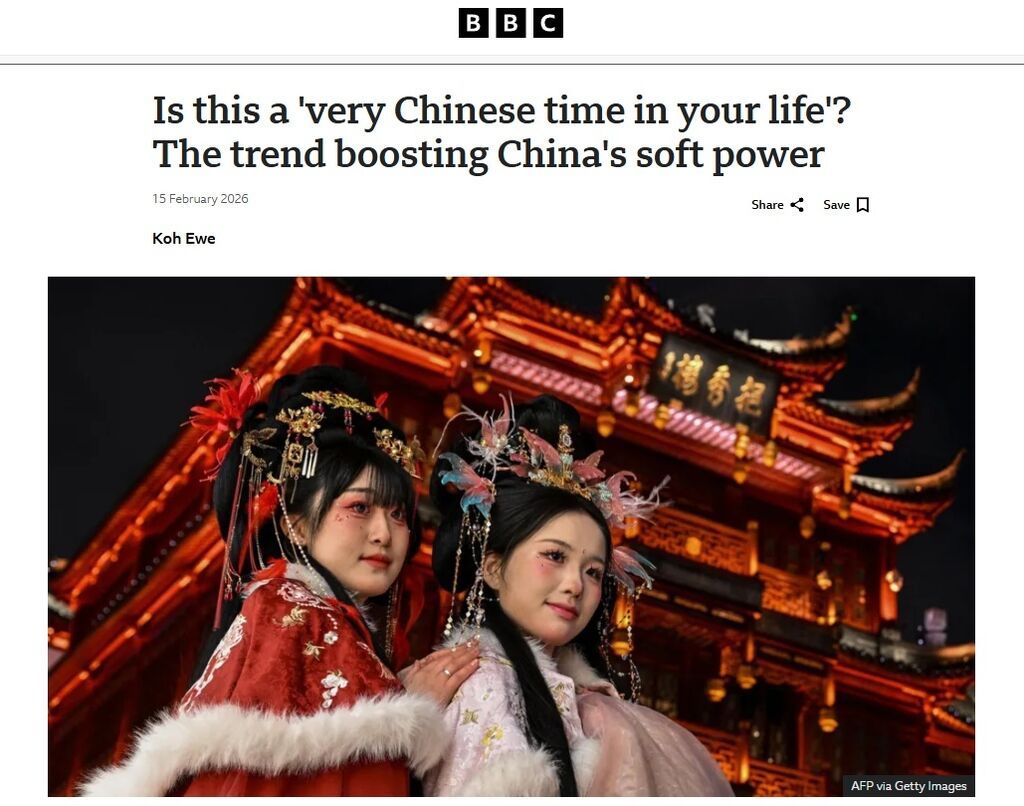英国广播公司(BBC)2月15日的报道提到,在社交媒体上,“Chinamaxxing”正在西方兴起。从煮苹果水到室内拖鞋再到长寿锻炼,人们都在分享自己“学做中国人”的视频。“Chinamaxxing”无疑为近期中国软实力的蓬勃发展增添了更多光彩。在过去的一年里,我们看到了全世界对中国文创娃娃的追捧,在全新的商店里排队购买中国流行品牌的珍珠奶茶和咖啡,查看朋友们在“赛博朋克城市”重庆的假期动态。