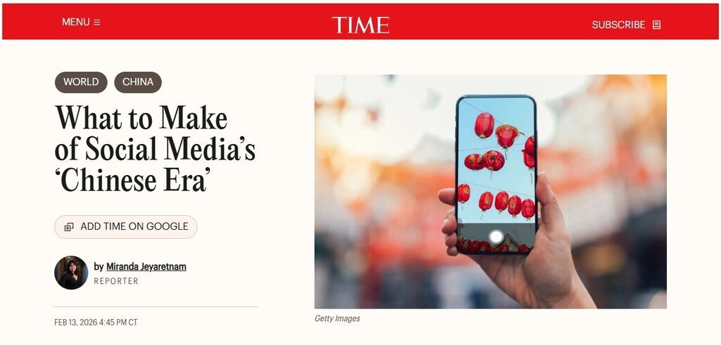 美国《时代》周刊网站2月13日的一篇文章称,伴随着今年的中国新年,社交网络上介绍中国文化的内容不少。这是一种新的趋势,美国社交媒体用户视自己为“中国人”,拥抱“Chinese era”(中国时代)或者“Chinamaxxing”(极致中国化)。观察家分析,这一趋势反映了随着中国的开放和软实力的提升,人们对中国越来越着迷。