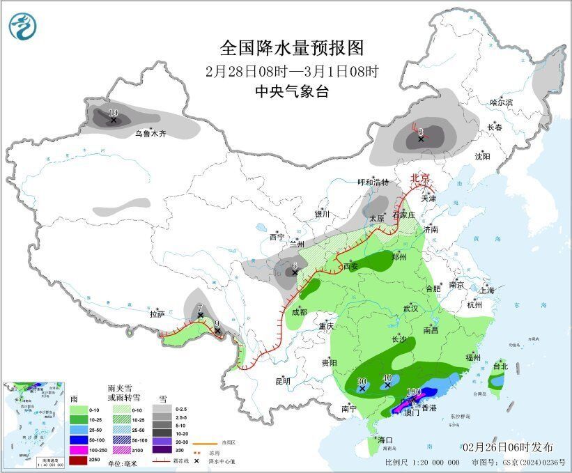 中央气象台预计,2月26日夜间至27日,江南中南部、华南等地将有小到中雨,其中贵州中东部、湖南、湖北东南部等地的部分地区有中到大雨,局地暴雨。2月28日至3月2日,黄淮及以南地区还有新一轮大范围降水天气过程,江南、华南等地部分地区有中到大雨,局地暴雨。