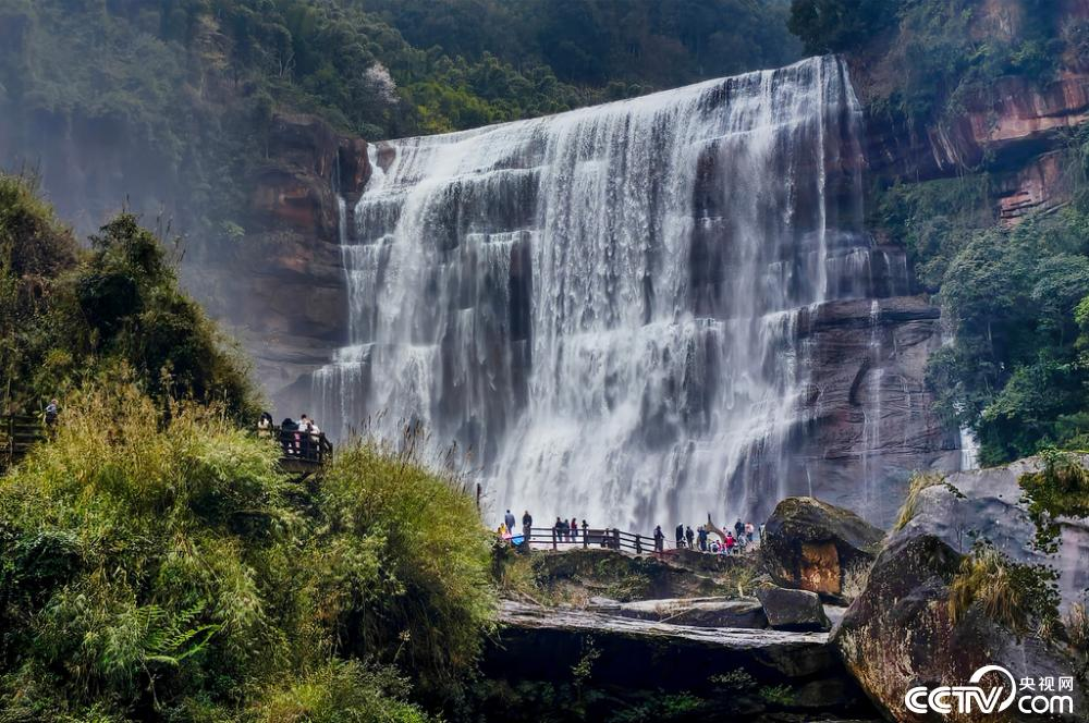 贵州遵义赤水丹霞大瀑布气势磅礴,丹霞赤壁与飞瀑流泉相映成趣,吸引各地游客前来赏瀑观景。