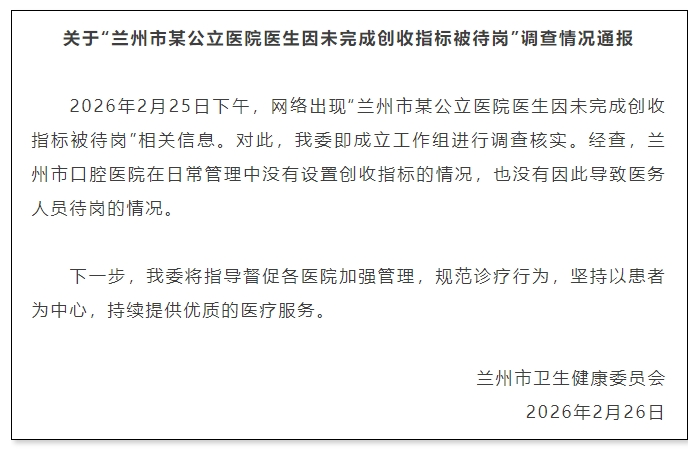 ·医生未完成创收指标被待岗?兰州市卫健委通报:不实。