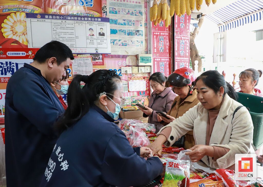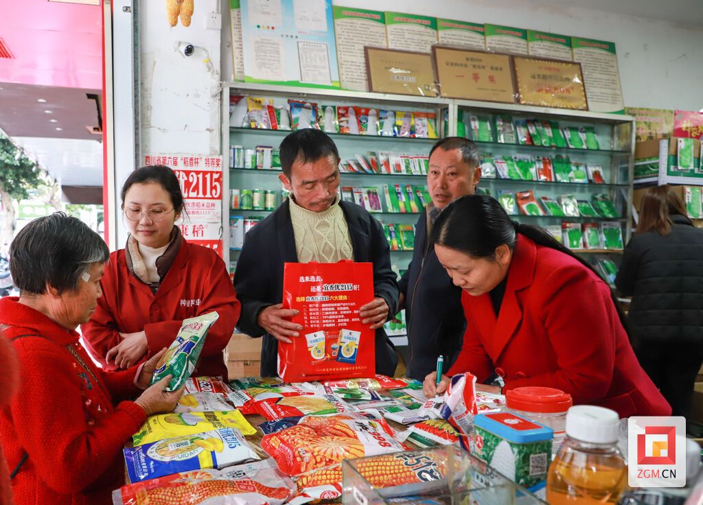 不远处的荣县庄稼乐农资经营部同样热闹。农户们围在柜台前,挑品种、议价格:“给我拿2包正红507的苞谷种,1包荃优607的谷种,今年价格咋样?给我优惠点嘛。”“放心,都是新年的优惠价。”店主笑着应答,手里麻利地拿货、打包。