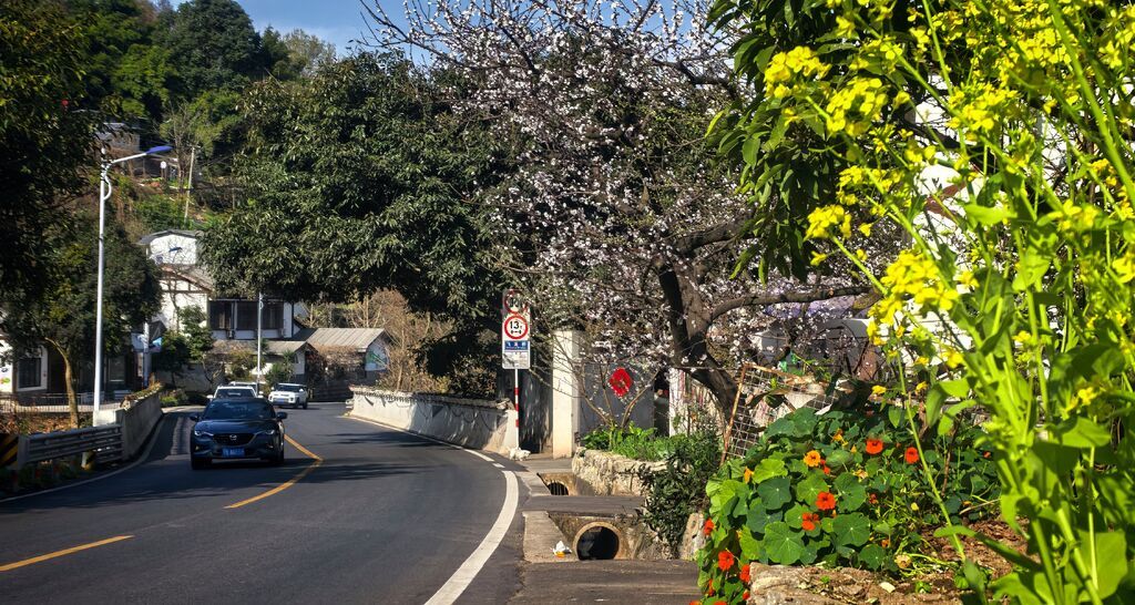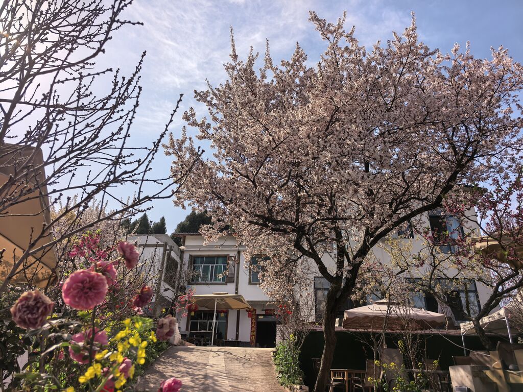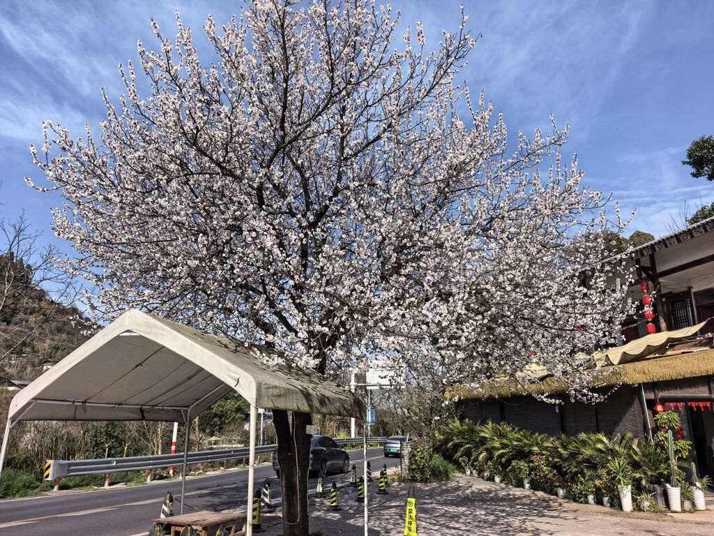 沿路缓行,仿佛走进了一场与春天的盛大约会。一树杏花就那么热闹地开在路旁,白中透着淡淡的粉,高雅又明媚。一些农家乐或民宿的院里院外,金黄的油菜花引来蜜蜂蝴蝶飞舞,白中透粉的红叶李开得喧哗,洁白的李子花则悄然打开了花蕾,仿佛去冬未下的雪又落在了枝头。