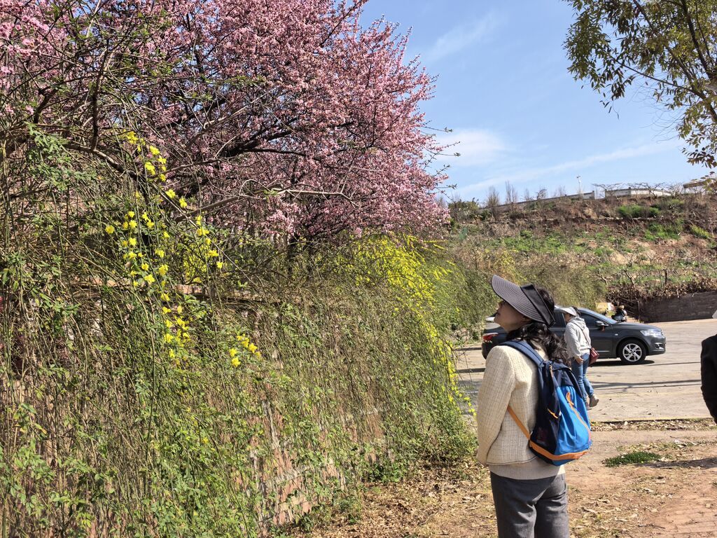一路春色,步步繁花。飞龙桥边,樱花尚还有些未谢,在枝头团成一簇簇的白;迎春花又拉开序幕,一丛丛明亮的黄色瀑布,仿佛在热情地招手。远处的仰天窝东面,玉兰花或株株洁白,或树树淡紫,渲染出春的纯净与端庄。