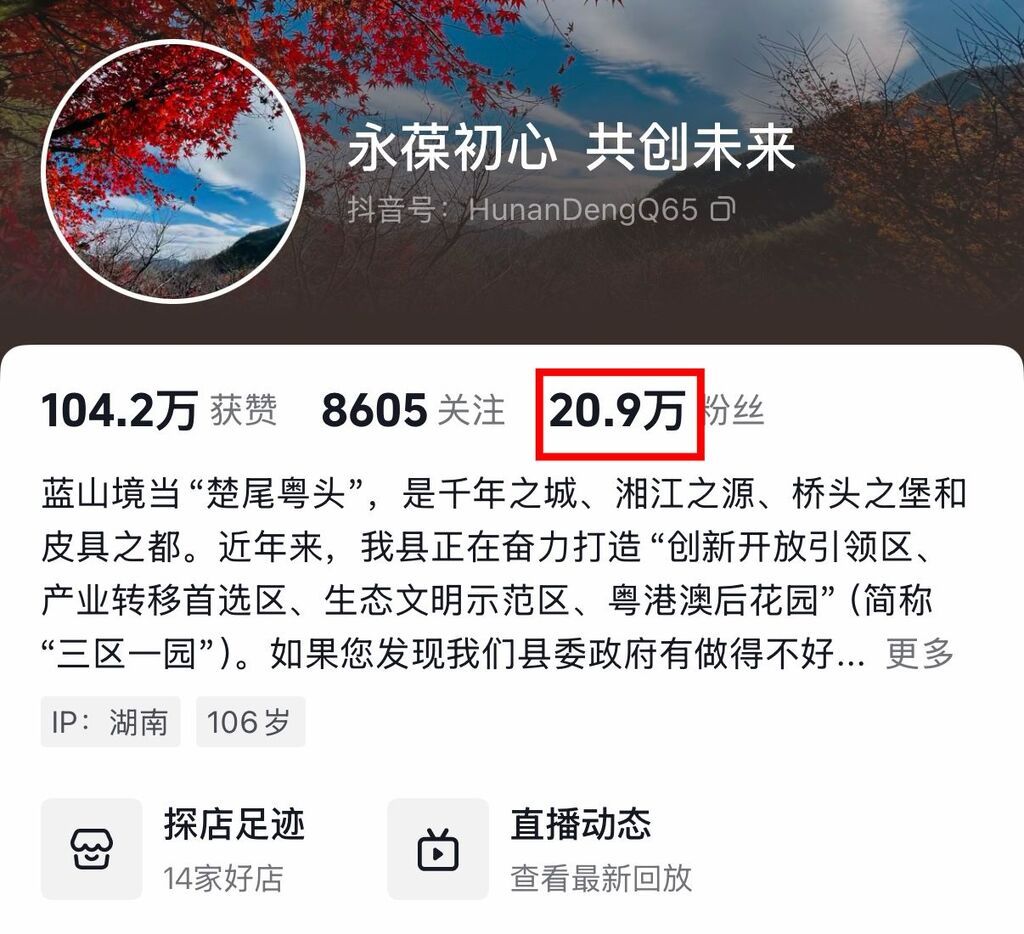 这几天,湖南蓝山县委书记邓群的抖音账号火了。粉丝一夜暴涨,截至今天下午,已突破20万。