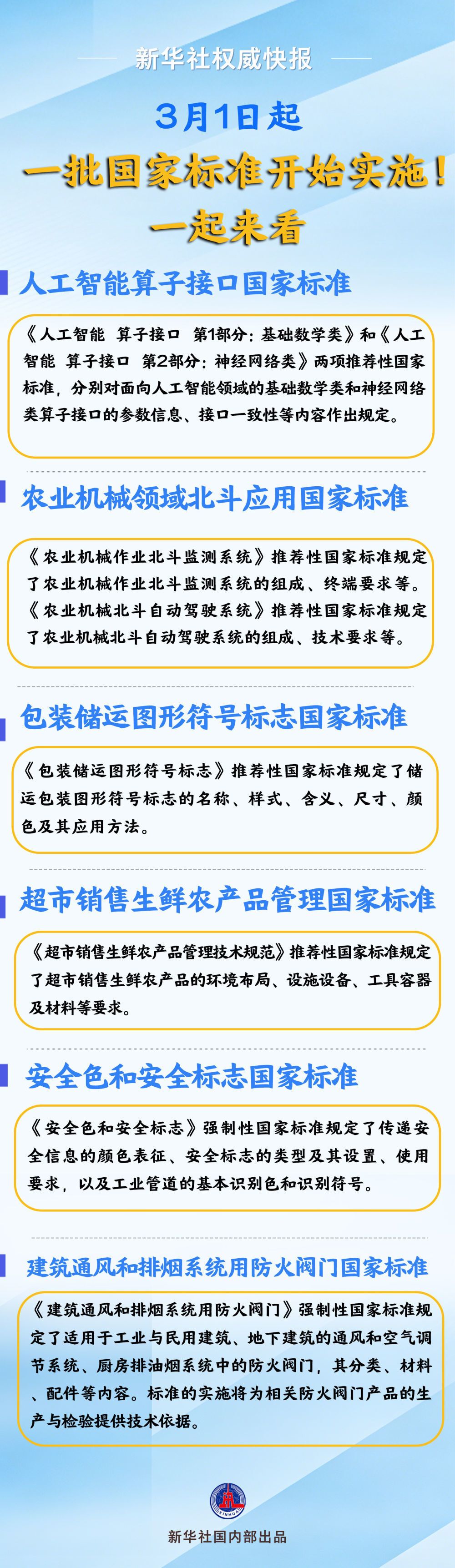 3月1日起,一批重要国家标准将开始实施,涉及算子接口、农业机械北斗应用、超市销售生鲜农产品管理、安全色和安全标志等诸多领域,将为促进产业转型升级,保障人民群众生命财产安全提供有力的技术支撑。一起来看!