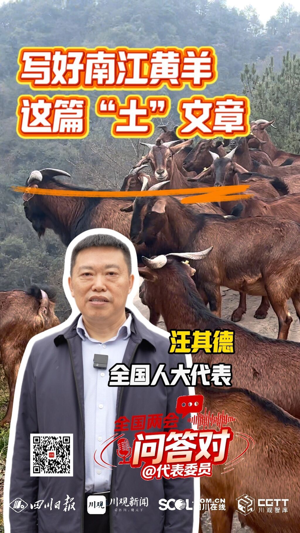 “能不能借助更多的现代化设施让养羊更省力?”“怎么靠养羊赚更多钱?”“我们南江黄羊的品质和产业附加值还能提高吗?”被誉为“亚洲第一羊”的南江黄羊,先后获得欧盟有机食品、国家地理标志保护产品等认证,品牌价值超过40亿元。如今,巴中市南江县的老百姓,都希望南江黄羊这块“金字招牌”更加响亮。而这些关于黄羊的问题,也成为全国人大代表、巴中市南江五郎黄羊养殖专业合作社理事长汪其德一直在努力回答的课题。