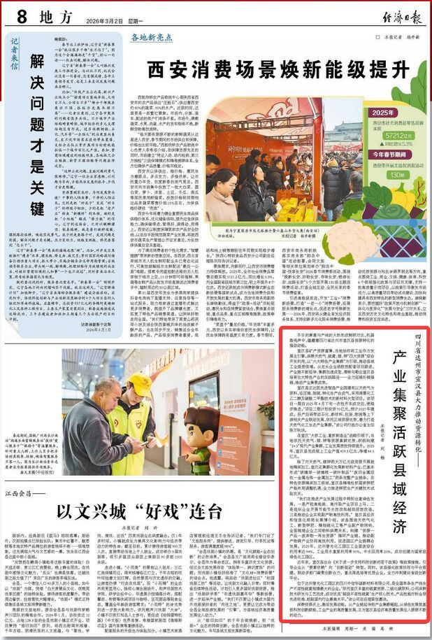 宣汉县矿产资源富集,当地始终将工业作为发展主引擎,深耕天然气、硫黄、锂、钾“四大资源”综合开发利用,以“六大特色产业集群”为引领,推动县域工业提质倍增。从龙头企业领航到配套项目跟进,产业链不断延伸、集群加速成型,清晰勾勒出宣汉县培育壮大特色产业的实践路径——全力延链补链强链,推动产业集聚成势。