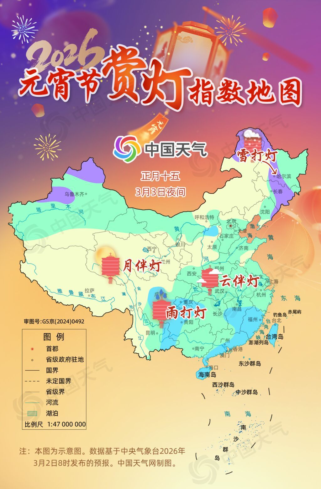 “有灯无月不娱人,有月无灯不算春。”明天(3月3日)就是一年一度的元宵佳节,今年元宵夜不仅会“十五的月亮十五圆”,还将上演一场月全食。届时,“红月亮”将与璀璨花灯交相辉映,为节日增添几分浪漫色彩。各地观赏天气是否给力?中国天气网特别推出2026全国元宵节赏灯指数地图,看哪里能一览“红月伴花灯”的视觉盛宴,哪里又有机会邂逅“雪打灯”的诗意景致。