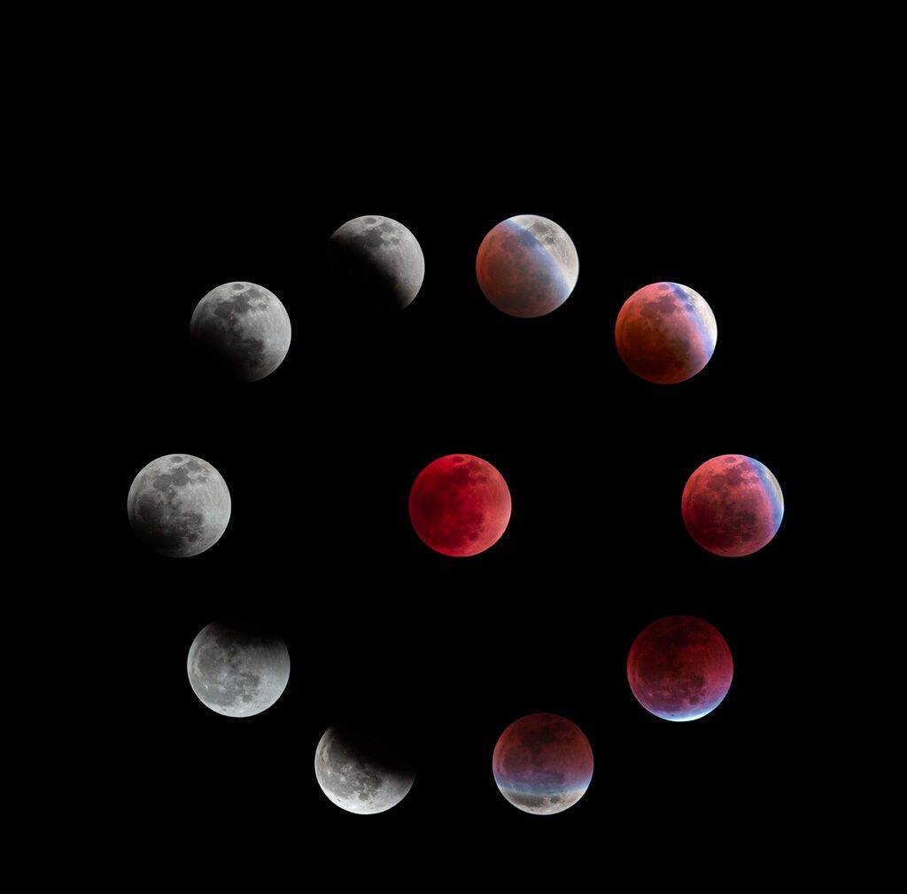 当月全食出现时,从地球上看去,整个月亮都呈现出古铜色,也就是大家所熟知的“红月亮”。但“红月亮”不是一蹴而就的,本次月全食主要分为初亏、食既、食甚、生光到复圆四大阶段。