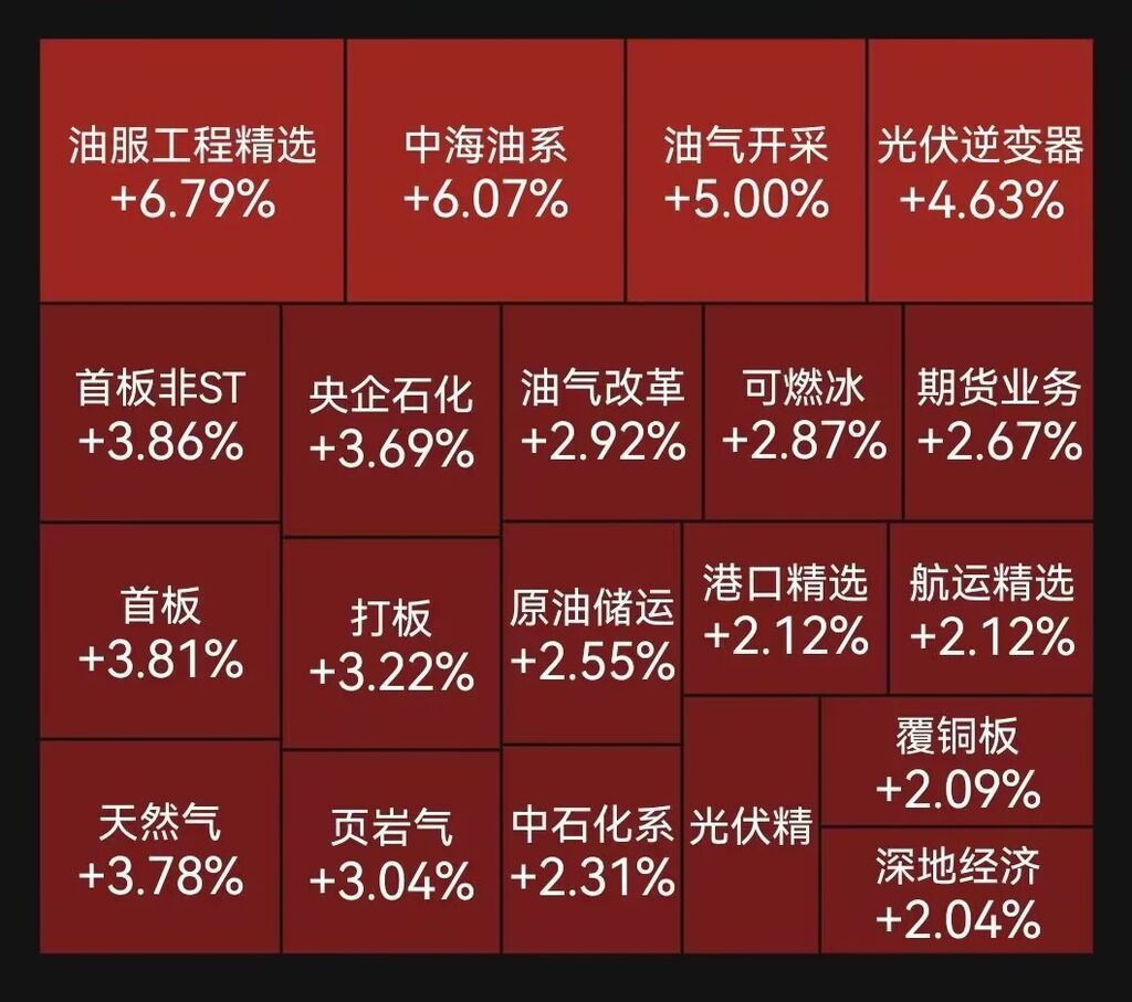 此外,油气开采、油服设备等板块领涨全市场;光伏设备、航运板块同步走强,军工、有色板块承压走弱。