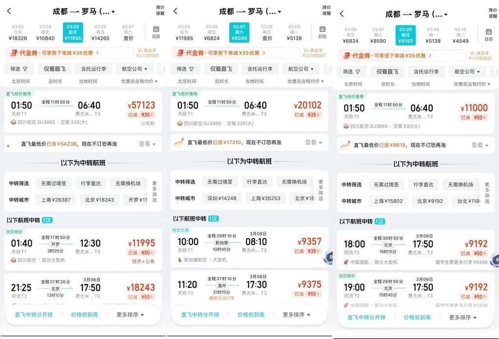 罗马是欧洲热门直飞目的地之一。成都至罗马最近航班为3月5日,经济舱已售罄,公务舱票价57123元(不含税),7日经济舱价格则涨至20102元,较前一周最低价上涨超17000元。该航线每周执飞四班,分别为周二、周四、周六、周日,飞行时长11小时50分钟。