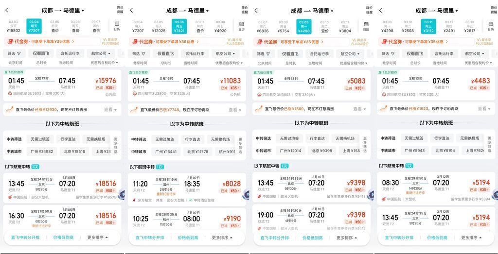 马德里作为欧洲重要中转站,成都至马德里3月4日直飞航班经济舱已无票,公务舱票价15976元(不含税)。6日、8日经济舱同样售罄,公务舱票价超11000元。9日起恢复经济舱机票,价格在4000元至5000元左右。