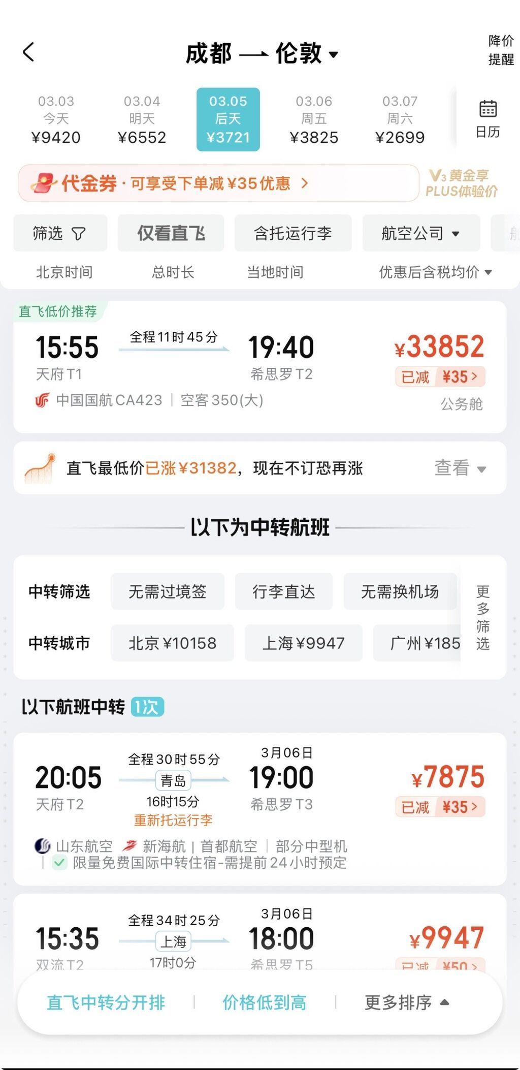 其他欧洲航线方面,成都至伦敦最近航班为3月5日,经济舱已售罄,公务舱票价超30000元;成都至法兰克福近段时间仍有经济舱余票,价格超10000元,较前一周最低价上涨超7000元。