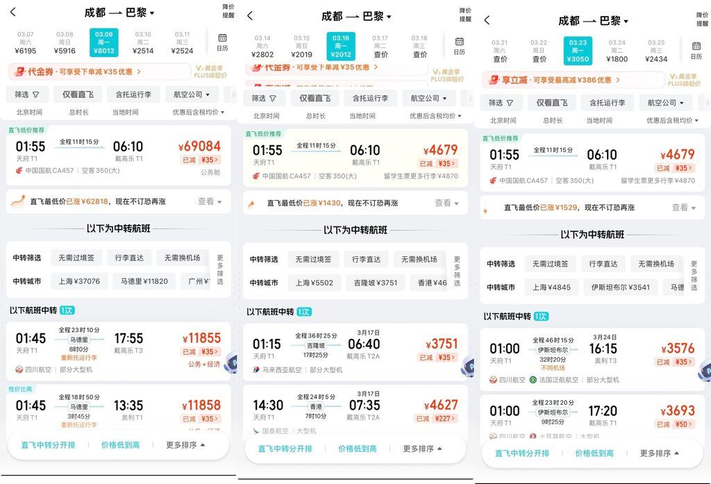 从成都出发的欧洲航线同样涨幅明显。3月3日,记者查询多个购票平台发现,成都至巴黎最近一趟直飞航班为3月9日,经济舱已无票,公务舱票价达69084元(不含税);3月16日、23日的航班价格回落,经济舱为4679元。该航线每周一班,周一执飞,飞行时长11小时15分钟。