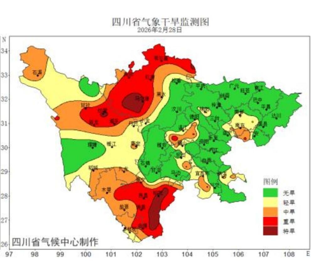 从农业角度看,2月盆地日照时数明显偏多,盆地大部较常年同期偏多1~2倍。充足的日照和偏高的气温整体利于小春作物生长,但由于降水空间分布不均,盆西北等地耕层土壤已显旱象,坡台地等保水能力较差地块苗情长势相对偏弱。据监测,截至2月28日,全省156个国家气象站中有82站出现气象干旱,重旱以上气象干旱出现在阿坝、成都、德阳、甘孜、广安、乐山、凉山、攀枝花等9市(州)。四川省气候中心提醒,春播期间,盆地中部、攀西地区南部有气象干旱发生,局部地区干旱强度可达中等,需关注干旱对农业生产、水资源调度的影响。