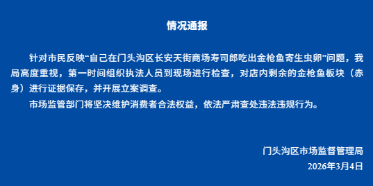 ·北京门头沟区市监局回应“寿司郎吃出金枪鱼寄生虫卵”:立案调查。