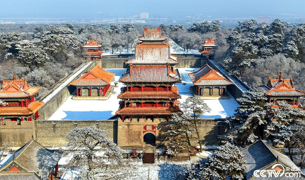 2026年3月4日,沈阳,雪后清福陵景区出现雾凇风光,白雪、雾凇与古建筑交相辉映,景色如画。