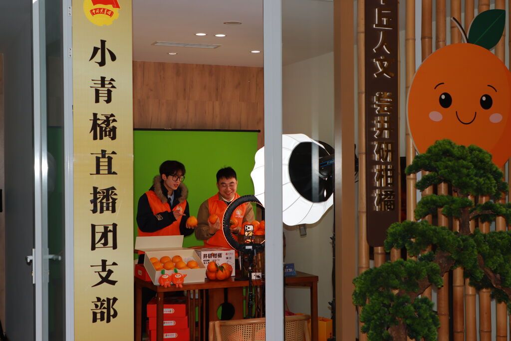 2022年2月,“井研县北柑南粮直播助农团支部”正式成立,这便是后来的“小青橘直播团支部(小青橘志愿服务队)”。依托农商互联集配中心、柑橘产业园区、新时代文明实践中心,12个直播助农服务点、1个共享直播间陆续落地。“直播需求在哪里,青年就在哪里”——这句承诺,从此写在了井研的土地上。