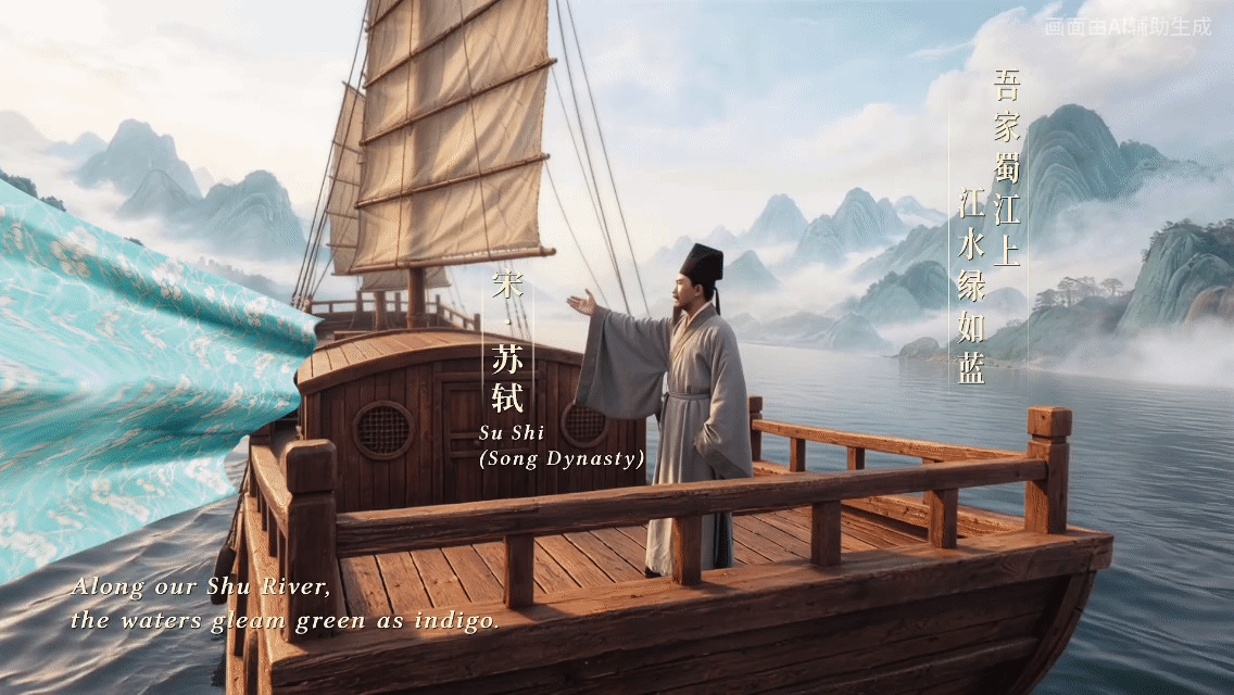 短片从深厚的历史底蕴起笔。蚕丛教民养蚕的远古传说、三千年前蜀锦初成体系的精工技艺、两千余年前成都设锦官城的历史荣光、蜀锦随丝绸之路声达域外的文明回响一一铺陈。这根贯穿历史的金线,“绘”出太阳神鸟、三星堆黄金面具的文化光芒,“绘”出文翁兴学、草堂春雨、东坡故里的诗书长河。“自古诗人例到蜀,好将新句贮行囊”,千年文脉在此奔流不息。