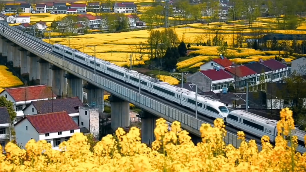 在江西万安县宝山乡狮岩村,1000多亩黄澄澄的油菜花竞相绽放,与蓝天、白云、村庄、列车构成了一幅美丽的乡村画卷。