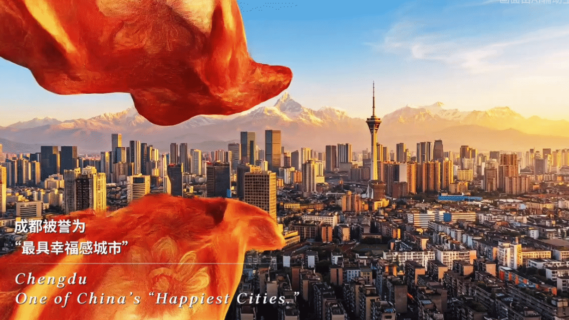 画卷继续铺开,暖色调晕染为人间烟火。盖碗茶香袅袅,川剧变脸惊艳,火锅与川菜撩动着无数味蕾,共同交织成这片土地特有的诗酒快意。彝族的火把炽烈燃烧,藏族的赛马奔腾激昂,羌族的瓦尔俄足节古朴庄重,多元民族的文化在此交融共生;绿道上骑行追风的少年、世运会绽放的焰火、金熊猫奖闪耀的奖杯、动画中哪吒闹海的豪情,以及“川超”球场里沸腾的呐喊……无数生动剪影,共同谱写着安逸生活与幸福社会的温暖乐章。