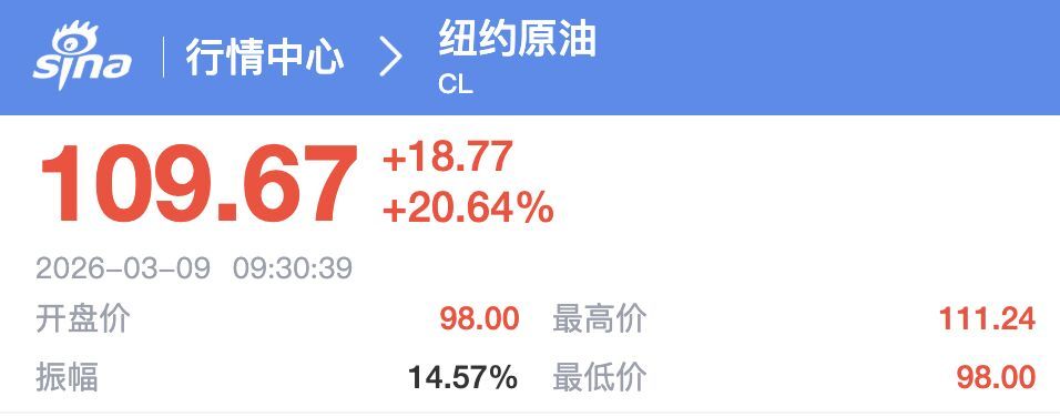 消息面上,中东战事导致石油输出受阻,叠加多个产油国因储油量趋满而被迫减产,国际油价在3月9日亚洲交易时段出现暴涨,截至北京时间9:30,纽约原油价格上涨超20%,报109.67美元/桶;布伦特原油价格上涨18.11%,报109.475美元/桶。此次国际油价突破100美元/桶,为自2022年俄乌冲突爆发以来首次。