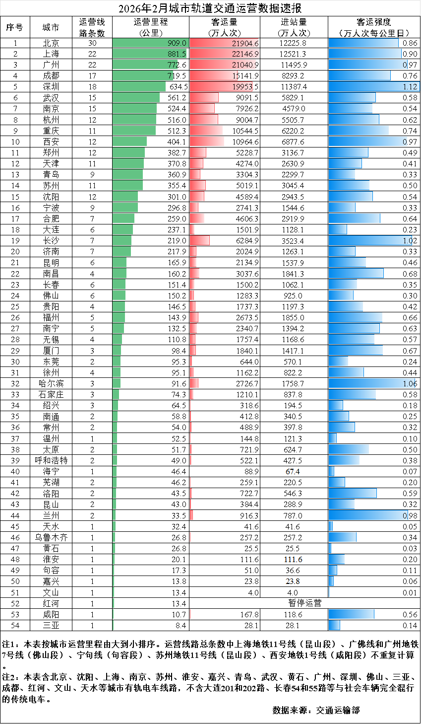 中新网3月10日电 据交通运输部微信公众号消息,2026年2月,31个省(自治区、直辖市)和新疆生产建设兵团共有54个城市开通运营城市轨道交通线路345条,运营里程11778.2公里,实际开行列车335万列次,完成客运量21.7亿人次,进站量13亿人次。2月份,客运量环比减少7.2亿人次,降低25%,同比减少2.3亿人次,降低9.6%。2月份全国总运营里程的平均客运强度为0.659万人次每公里日。
