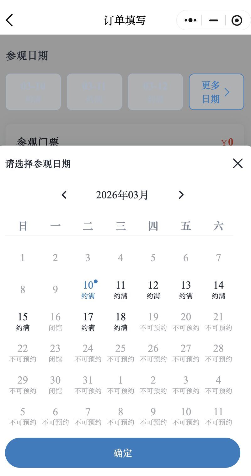 3月10日,记者在官方公众号上看到,3月11日至3月18日的票(除每周一闭馆日)显示为“约满”,19日以后的票则为“不可预约”。