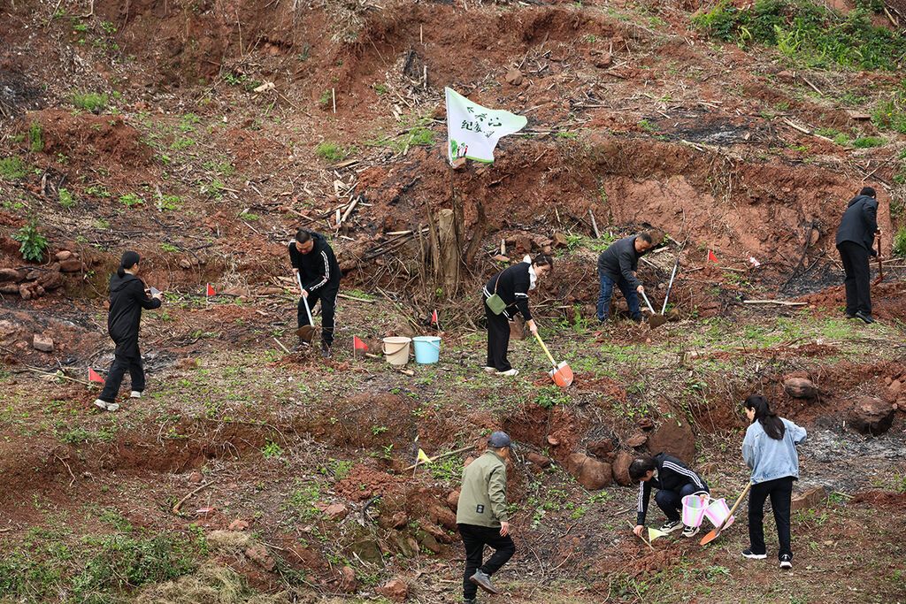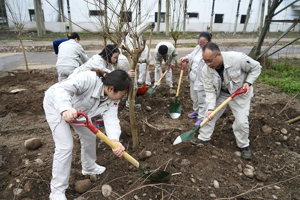 五通桥区西坝镇庙沱村,来自全区的机关干部、企业代表们三五人一组有序配合,让326株红叶李、红梅、紫薇、红枫新苗错落有致地扎根山坡。“种一棵活一棵,植一片绿一方。”现场一位林业技术人员一边指导栽种一边介绍。当地坚持管育并重,全程技术指导,把义务植树与城乡生态更新有机融合,让群众“推窗见绿、出门入园”。