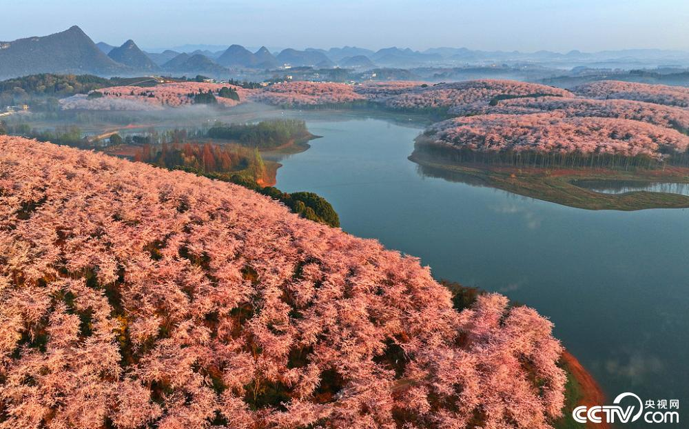 3月12日,贵州安顺平坝区红枫湖半岛的万亩樱花进入盛花期。航拍镜头下,连绵起伏的山坡与湖心半岛被层层叠叠的樱花花海覆盖,如同一片片绯红的云霞镶嵌在碧波荡漾的红枫湖畔。