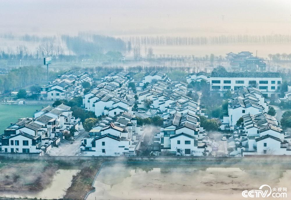 3月12日,江苏省宿迁市泗洪县石集乡瓦房村晨雾缭绕,古汴河畔如诗如画。新式民居错落有致,在薄雾中若隐若现,与汴水风光相融。