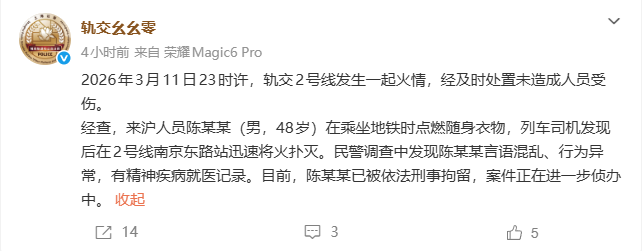 ·男子乘地铁时点燃随身衣物,上海轨交警方通报:有精神疾病就医记录,已被刑拘。