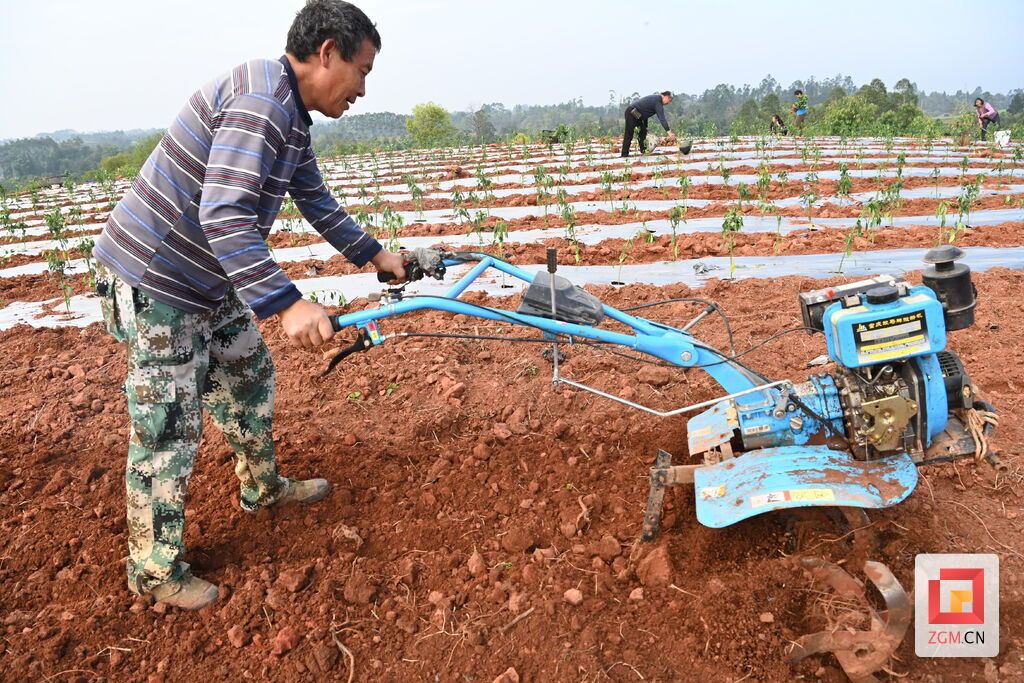 在古文镇鹰嘴塘村的山坡上,村民陈兴友驾驶着耕整机,在一块约1亩的椭圆形大田里来回穿梭。铁犁翻起新土,一股浓郁的泥土芬芳扑面而来。田埂边,5名村民正忙着移栽辣椒苗,打窝、下种、覆土,动作娴熟利落,一颗颗玉米种子在新翻的泥土里埋下了丰收的希望。