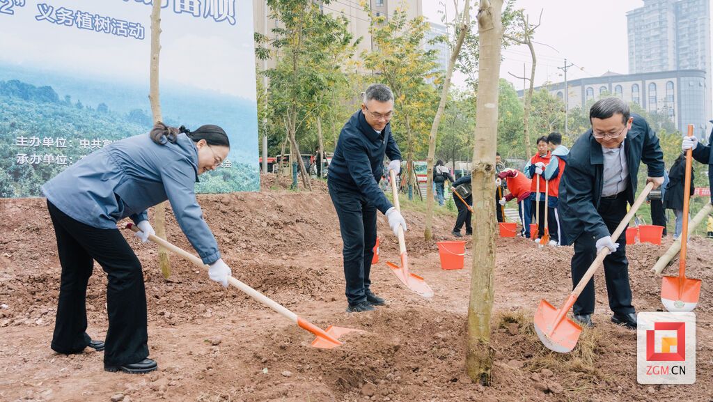 植树现场一派繁忙有序的热闹场景。刘军、郭洁、郑向东等来到植树点,立即投入到植树劳动中,大家分工协作、默契配合,挥锹扬铲、覆土浇灌,共同种下新一年的“绿色希望”。