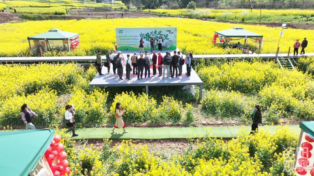 当日午后,暖阳正好,帅府粮仓农旅融合园内人声鼎沸。30余名川渝地区的摄影家举着相机穿梭花海,网红大V忙着记录美景,游客们或在花田打卡拍照,或围坐在挂满红灯笼的火锅桌前,感受“把春天煮进火锅里”的独特浪漫。