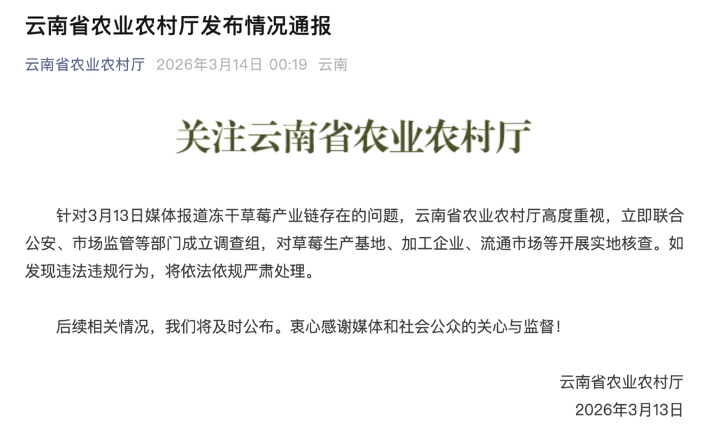 ·冻干草莓重金属镉严重超标,测出20多种农药残留?云南成立调查组严查产业链违法违规。