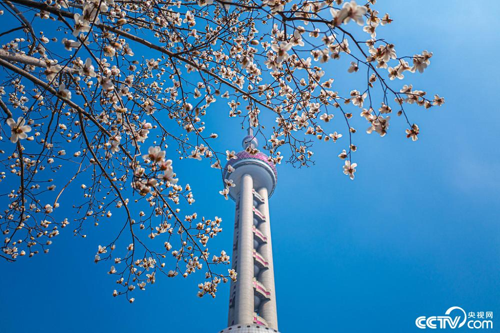 上海浦东新区陆家嘴环岛,玉兰盛开,成为一道亮丽风景线,吸引不少人前来赏花。