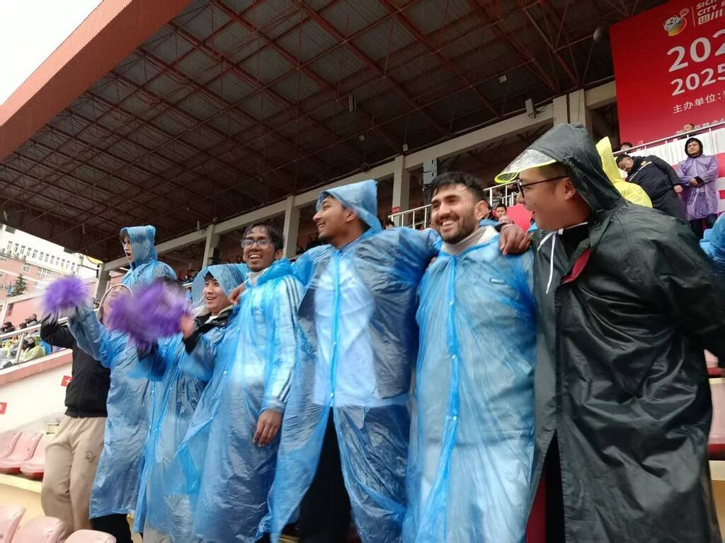 “Exciting!”“太嗨了!”震耳的助威声中,夹杂着不同的语言与肤色。看台一角,由西华师范大学各国留学生组成的助威团,成为雨中最亮丽、最热情的一道风景线。