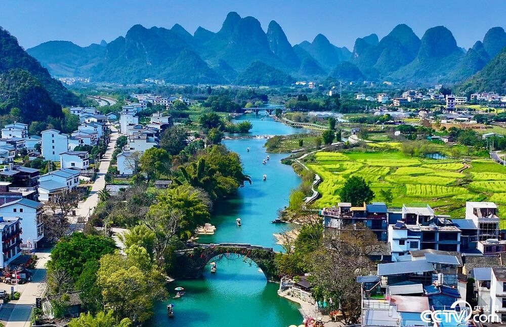3月13日,广西桂林遇龙河景区春光无限,游人泛舟水面,穿行在绿水青山之间。