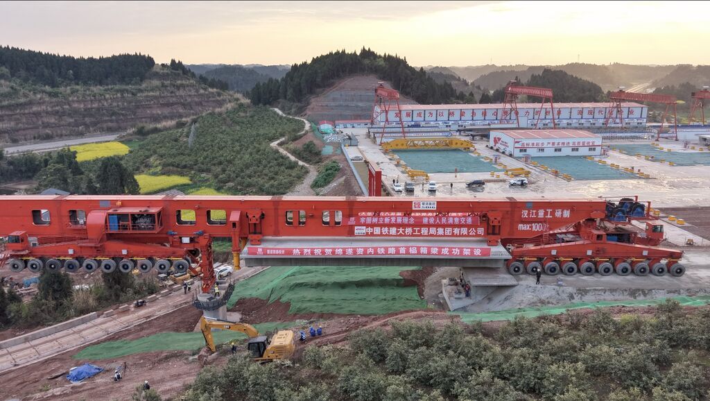 绵遂资内铁路项目首榀箱梁架设现场(蜀道集团供图)