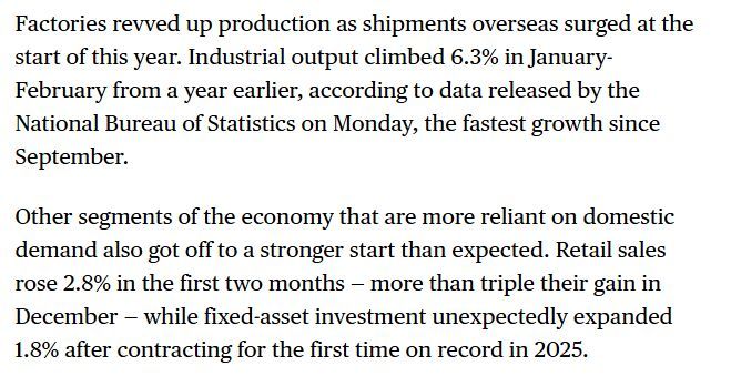 彭博社则更强调内需改善释放出的积极信号。报道说,2026年初,中国经济开局向好,国内消费和投资回升,随着海外出货量增长,工厂生产也随之加快。彭博社认为,那些更依赖内需的经济领域,同样出现了超出预期的强劲开局。前两个月零售额同比增长2.8%,是去年12月增幅的三倍多;固定资产投资也实现了同比增长1.8%。