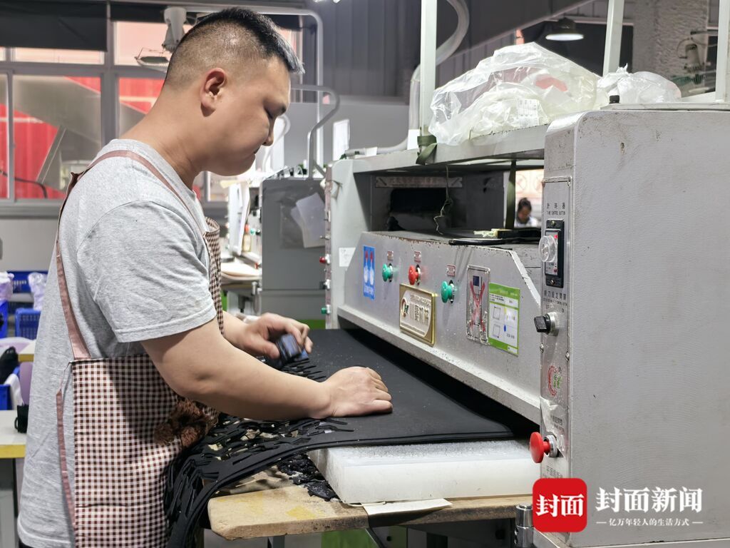 “不能拍照哟,这条生产线上正在制作的是下一季的新产品。”翰彬霖行政经理易鹏告诉记者。翰彬霖在三台的工厂主要为某国际品牌代工,月生产总量约为50万双。“目前已经是‘爆单’的状态,订单已经排到了7月,目前最需要的就是大量招工,至少还要招100-200名工人。”