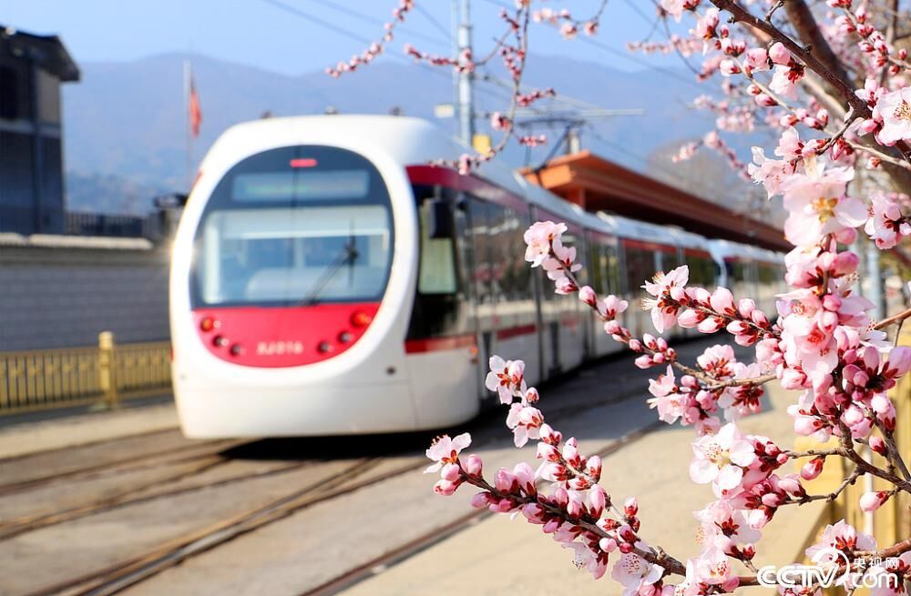 3月15日,在北京有轨电车西郊线香山站,列车在绽放的山桃花丛中穿梭而过,构成了一幅美丽的春日画卷。