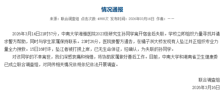 ·中南大学湘雅医院一失联研究生坠江离世,中南大学、湖南省卫健委成立联合调查组。